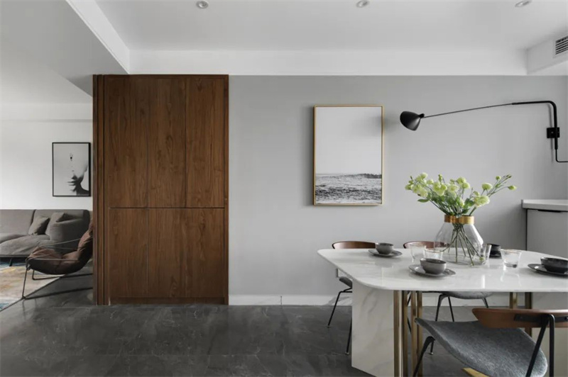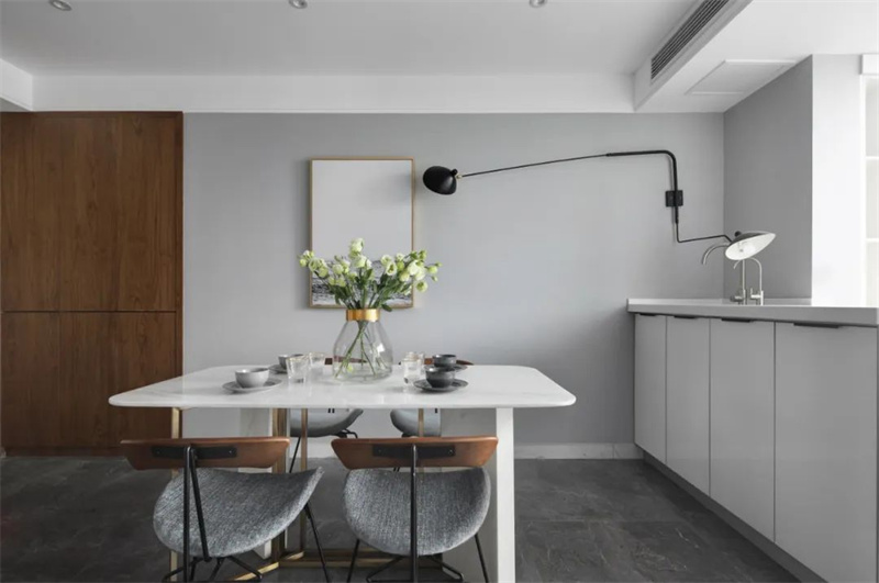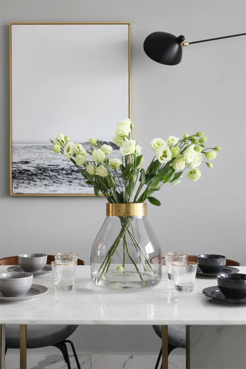 餐厅白色餐桌配灰色布艺餐椅,舒适又耐看,桌上的花束和餐具点缀出生活气息。墙上的艺术画和黑色壁灯提升了空间质感,木质储物柜则增添了一丝自然温暖。大窗户引入自然光,让整个区域明亮舒适,兼具美感与实用性。