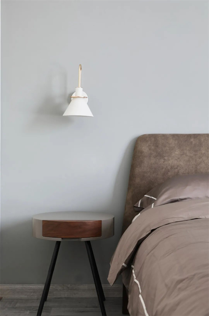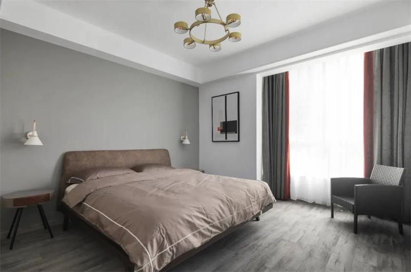 主卧简约舒适,灰色木地板搭配浅色墙面,营造出宁静放松的氛围。深棕色软包大床搭配同色系床品,温暖协调。床头两侧设有壁灯和小凳,方便实用,墙上一幅抽象画增添艺术感,整体空间实用又温馨。