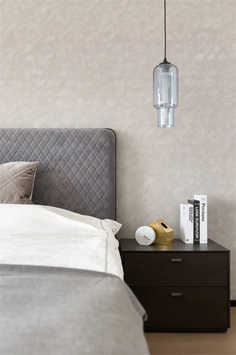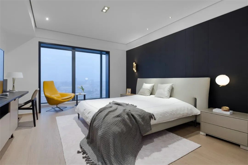 主卧以简洁线条和低饱和色调,营造出宁静舒适的睡眠氛围。落地窗引入充足采光,视野开阔,连接室内外的宁静时光。一侧设置小型工作角,书桌搭配亮色单人椅,兼顾实用与设计感。床头壁灯、香薰与装饰摆件点缀其间,细节中透露着生活温度。