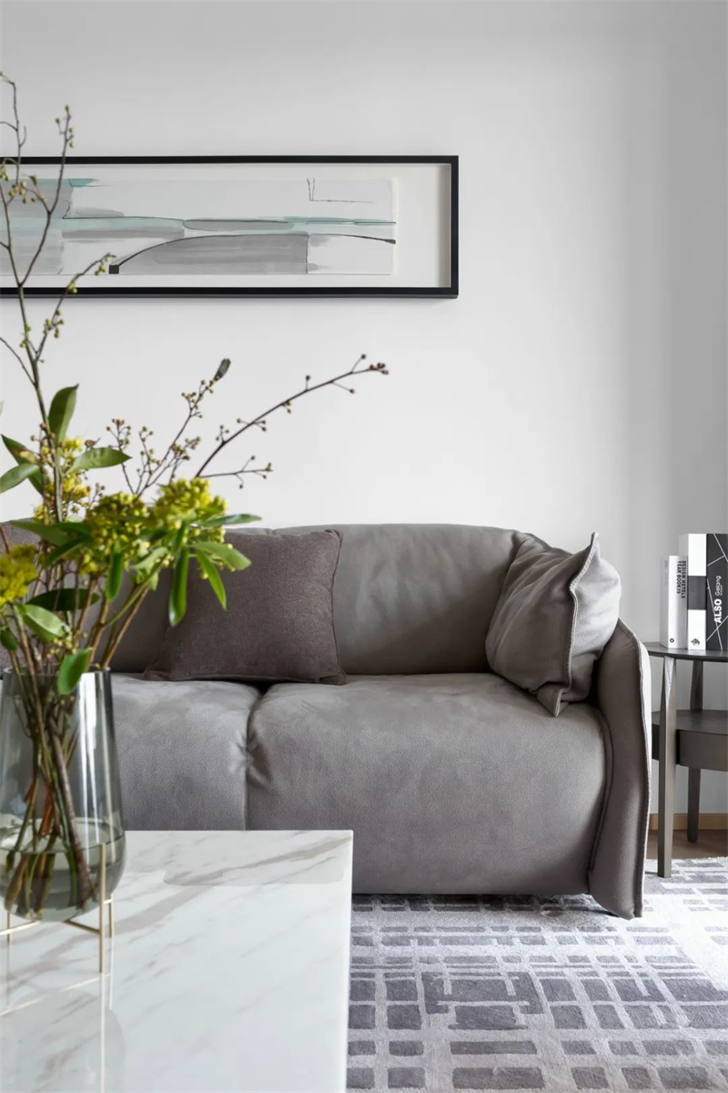 客厅以白、灰为主色调,搭配木质地板和黑色金属线条,整体简洁明快,充满现代感。灰色布艺沙发与大理石茶几组合,舒适又不失质感,搭配几何图案地毯,提升空间层次。这里没有繁复装饰,却处处体现功能与美学的平衡。