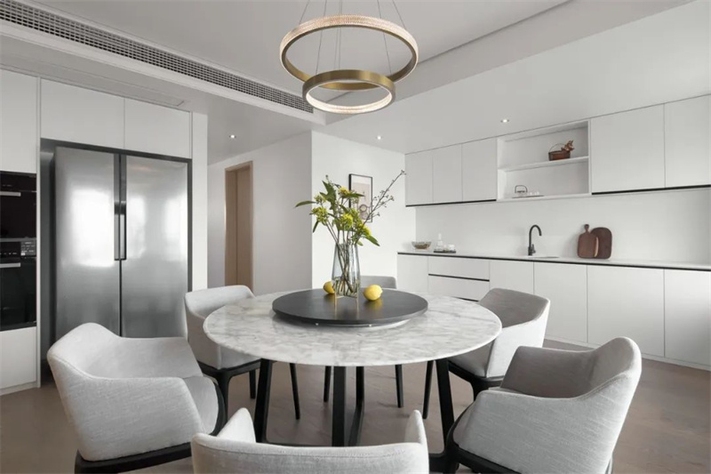 现代风格的餐厅延续整体简约基调,圆形大理石餐桌搭配灰色餐椅,质感温润又不失高级感。上方双层圆环吊灯造型独特,暖光洒落,营造出温馨的用餐氛围。一旁的墙面装饰与开放式置物架增添生活细节,功能与美感兼具。