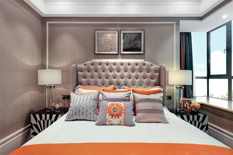 主卧中,优雅与奢华交织成了一幅梦幻的画卷。床头采用软包设计,柔软的天鹅绒床品与大飘窗相互呼应,金属边框的镜子与床头柜上简约的台灯为卧室增添了一丝现代感,同时保持轻奢的调性,使空间既舒适又不失格调。