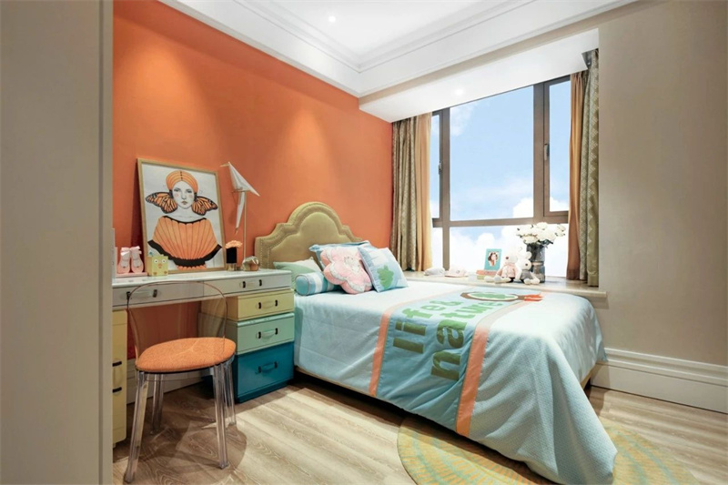 儿童房充满温馨与活力,设计简洁却极具趣味性。房间的主色调以橙色为主,配合原木色地板,营造出轻松愉快的氛围。床头设置了一张书桌,阳台明亮的光线洒入室内,为孩子提供了理想的学习和游戏区域,增添了童趣和活力。