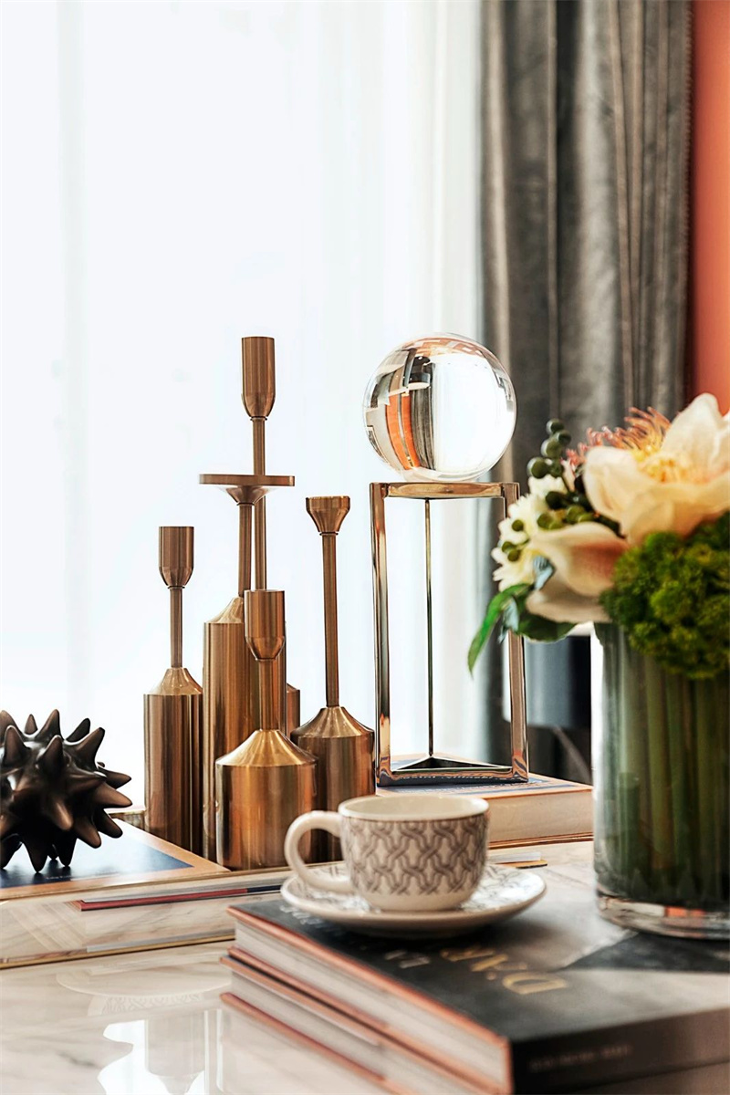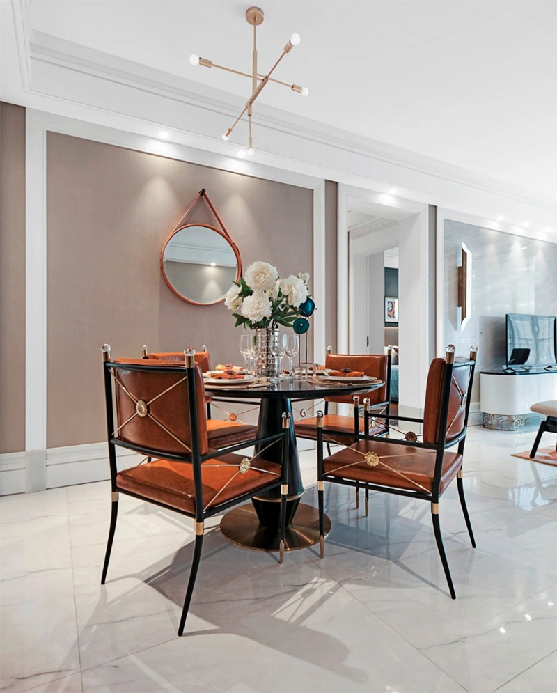 餐厅设计讲究细节与品质的融合。中央的餐桌简洁大气,围绕它摆放着几张极具辨识度的爱马仕橙色餐椅,与同色系的装饰品相互呼应,为餐厅增添了一丝活力和时尚感。餐桌上精致的餐具与花艺装饰,为每一餐的时光赋予满满的仪式感。