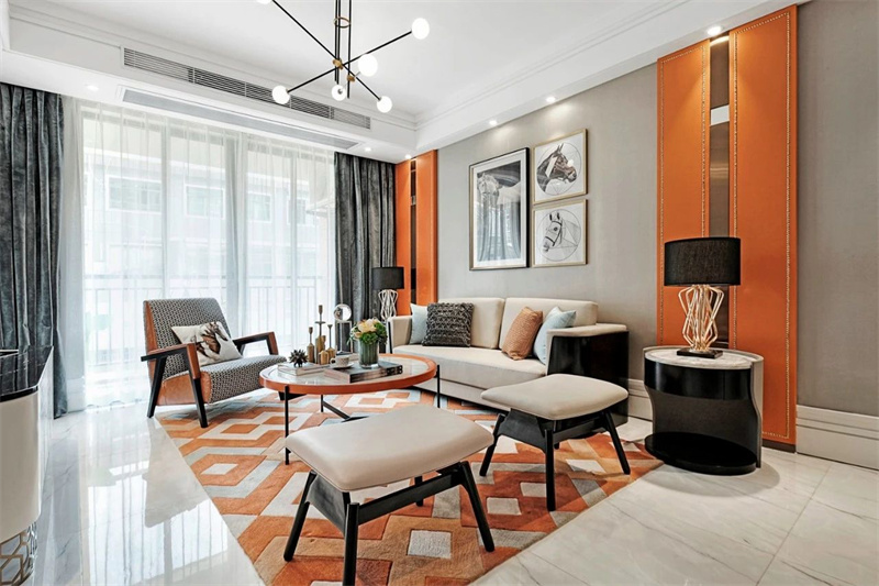 客厅的设计完美诠释了法式轻奢的精髓,一张极具视觉冲击力的爱马仕橙色地毯铺陈于大理石地面上,与浅米色的沙发和金属质感的茶几形成鲜明对比,营造出层次分明的视觉效果。柔和的灯光与古典装饰挂画,为整个空间增添了一份温暖的浪漫氛围。