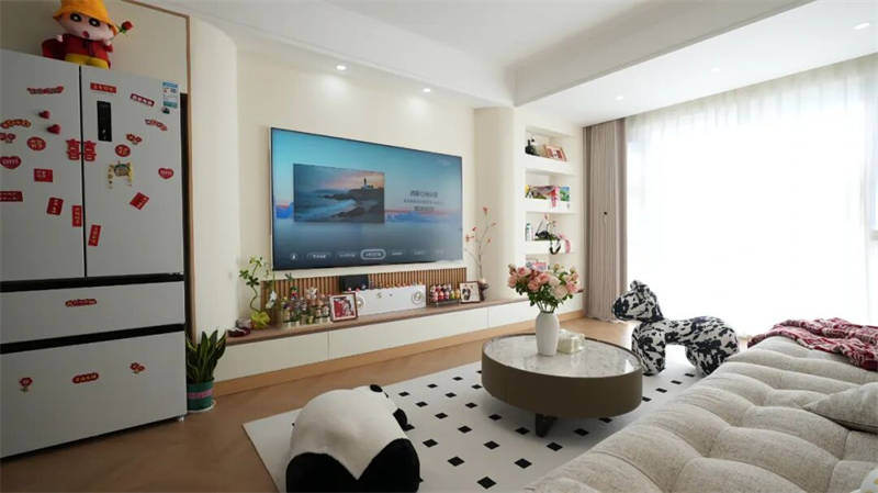 客厅里,米白沙发搭配几何地毯,点缀一抹红喜字与熊猫玩偶,传统与童趣悄然融合,让家在简约中透出满满温度与个性。这不仅是一次装修,更是一种松弛而有爱的生活方式的开启。