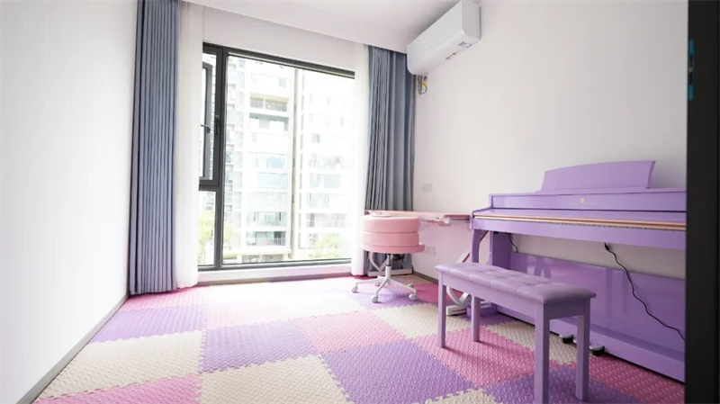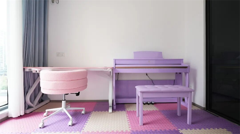 书房整体以柔和的粉紫系为主调,一整面落地窗引入充足自然光,搭配灰蓝色窗帘,既保证采光又调节光线柔和度,为专注学习提供舒适环境。房间中央摆放着一架淡紫色电钢琴,配同色系琴凳,优雅中透着可爱,激发孩子对音乐的热爱;一侧是可升降书桌,搭配柔软粉色毛绒椅,科学护眼又兼顾舒适,满足书写、阅读与作业需求。