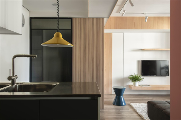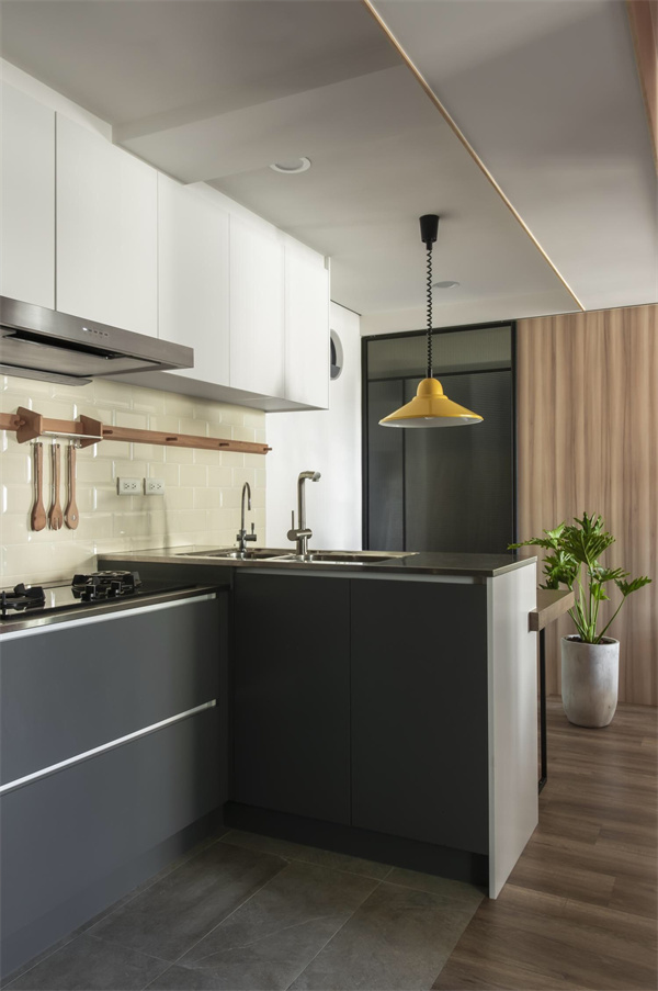 为节约空间,厨房采用半开放式设计,各种厨具和储物空间布局合理,白色吊柜搭配深色橱柜,形成鲜明的对比,既简约又富有层次感。大面积的台面空间提供充足的操作空间,更融合了家庭生活的温馨和舒适,在烹饪和用餐中尽情享受家的温暖。