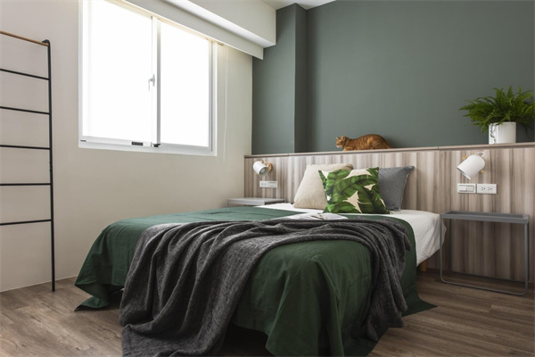 深绿色背景墙为房间增添了一抹生机和深度,仿佛将自然的宁静引入室内。大窗户将充足的自然光线引入室内,使空间明亮而通透,同时与室外的美景相连,享受惬意美好居家生活。