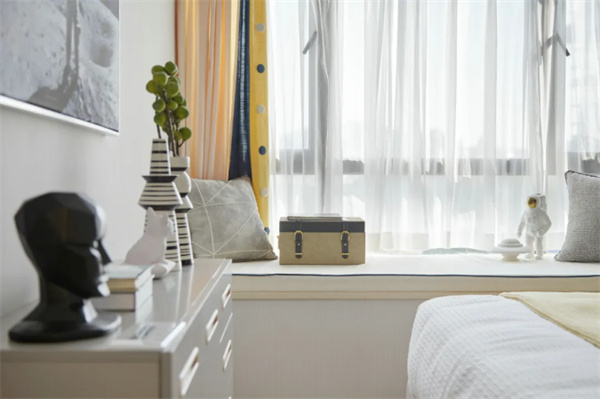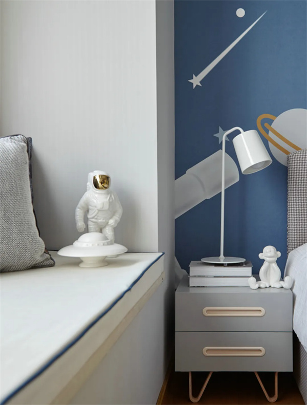 儿童房的设计理念中,简约并非剥夺趣味。柔和的蓝黄色组合是主导色调,搭配原木色家具,保留了童真的活泼感,同时呈现现代简约设计理念。简洁而有趣的壁纸和可爱的软装为儿童房注入了生气和活力。