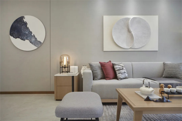 客厅主色调采用白色墙面与灰色地砖搭配,创造出通透明亮的空间感。低调的中性色调沙发展现简约品味。墙上点缀着一些精致的极简设计装饰画和摆件,为整个客厅注入一丝艺术氛围。